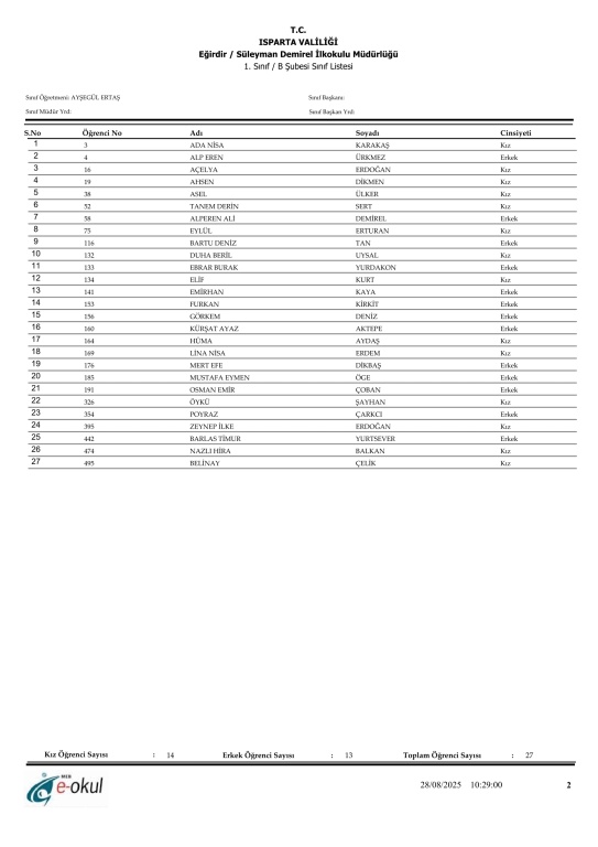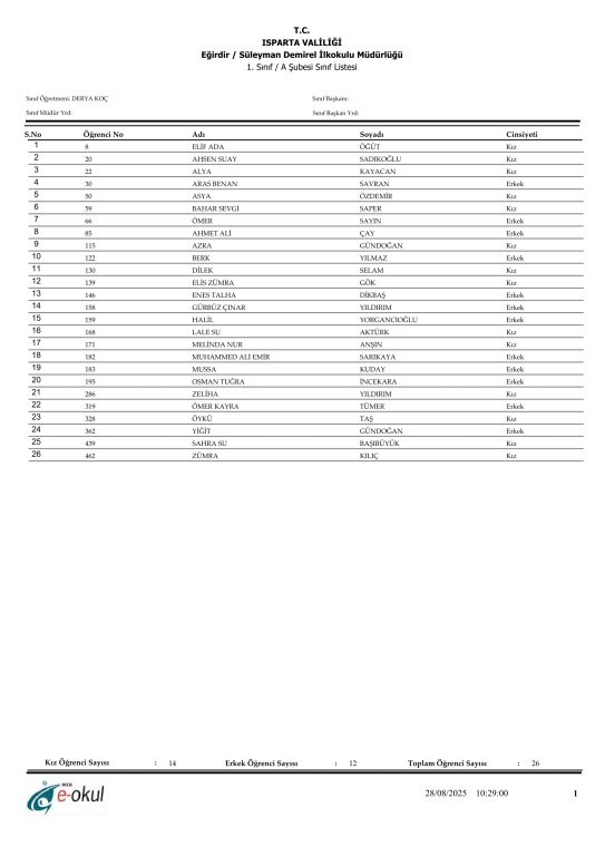 2025 - 2026 Eğitim Öğretim Yılında 1. Sınıfa Başlayacak Öğrenci Listeleri