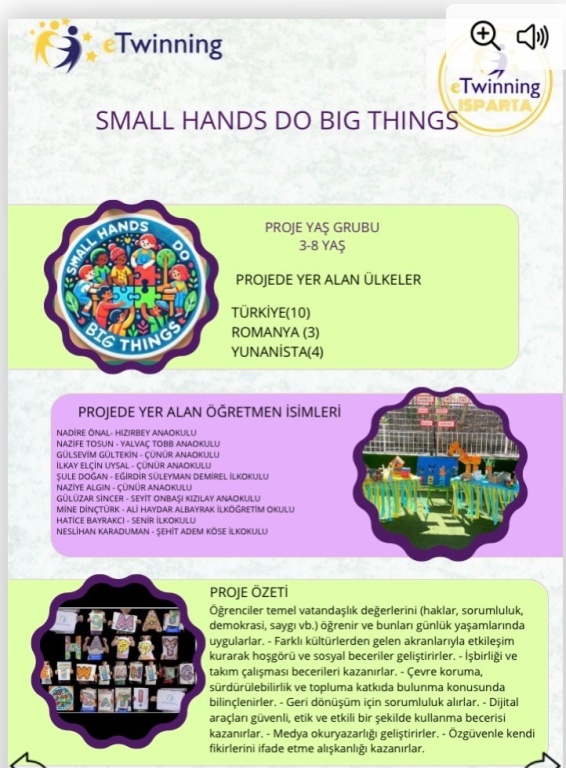 Eğirdir Süleyman Demirel ilkokulu olarak katılım sağladığımız''Small Hands Do Big Things” (Küçük Eller Büyük İşler Yapar) isimli projemizi başarıyla tamamlamanın mutluluğunu yaşıyoruz.